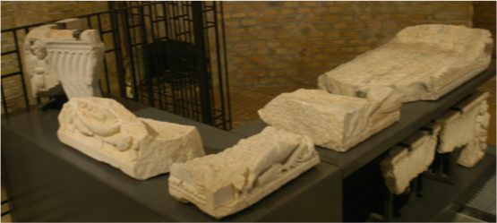 Gli eroti o amorini sono uno dei motivi iconografici più diffusi nell’arte classica. Derivano il loro aspetto e gli attributi dal dio dell’amore, ma traggono molti dei significati simbolici anche dall’ambito dionisiaco, dove rappresentano l’alternarsi della vita e della morte e, contemporaneamente, lo stato di felicità delle anime nell’aldilà (1-3). La connotazione funeraria deriva principalmente dall’impiego di Eros in scene allusive ad amori infelici, in cui viene rappresentato triste, a capo chino e con la torcia (simbolo dell’ardore) rivolta verso il basso (5). Con valenza di eroizzatori del defunto ed espressione di speranza in una vita oltremondana appaiono anche come portatori dei busti-ritratto (4).